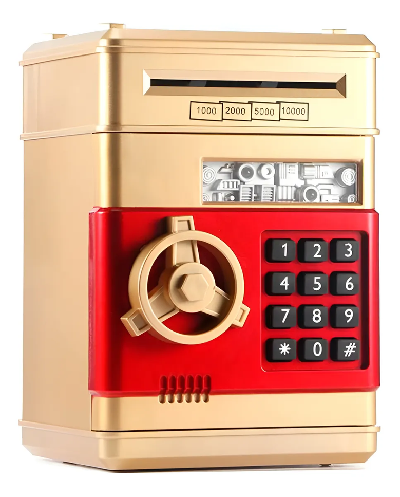Diseño Atractivo y Funcional: Con un moderno y llamativo color dorado, esta alcancía se convierte en un objeto decorativo en cualquier habitación infantil. Funciona con pilas (no incluidas) y su diseño robusto está pensado para resistir el uso entusiasta de los más pequeños.