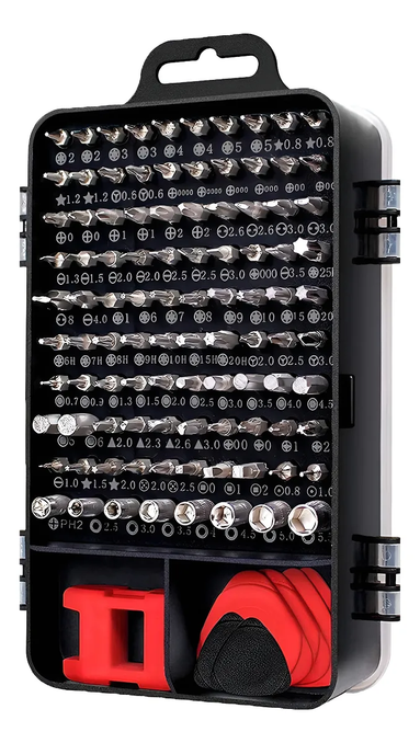 El kit cuenta con una amplia variedad de puntas de destornillador intercambiables (Phillips, Pentalobe, Tri-wing, Torx, Flathead, entre otras) que cubren la mayoría de los tornillos utilizados en la electrónica moderna. La base organizadora magnética mantiene todas las piezas seguras y en su lugar, evitando pérdidas y facilitando tu trabajo.