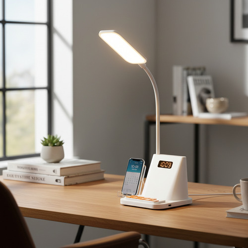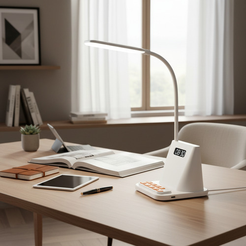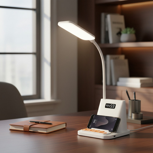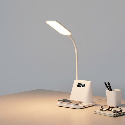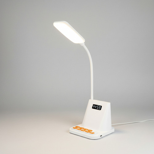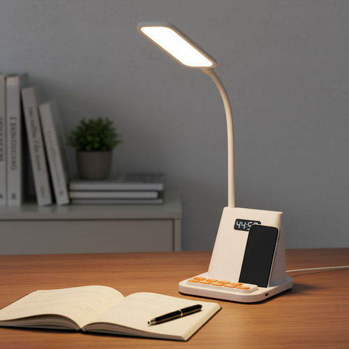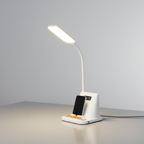 Descubre la lámpara de mesilla multifunción que organiza tu espacio y tu tiempo. La Lámpara de Gestión del Tiempo Dehuka combina en un diseño moderno y compacto una luz LED de 1W con brazo flexible, un reloj digital con alarma y un práctico soporte integrado para tu teléfono móvil. Ideal para tu mesa de noche o escritorio, te ayuda a mantener un ambiente ordenado, iluminado y puntual.