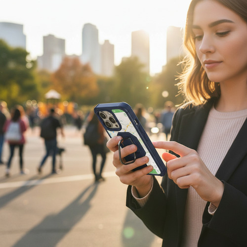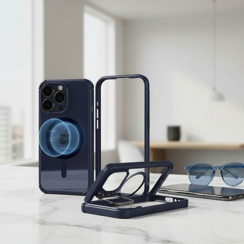El elemento central de esta funda es su sistema magnético de alta potencia, perfectamente alineado con el estándar MagSafe. Esto garantiza un acople instantáneo y seguro con cargadores inalámbricos, soportes para vehículo y power banks compatibles, permitiendo una carga eficiente sin sacrificar la protección. Además, la base integrada se despliega para convertir tu teléfono en un práctico stand con ángulo ajustable. Ideal para disfrutar de contenido en streaming, realizar videollamadas cómodamente o utilizar el modo manos libres mientras cocinas o trabajas.