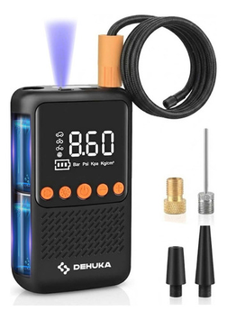 Olvídate de las estaciones de servicio y las bombas manuales. El Inflador Portátil Dehuka es tu solución de aire compacta, potente y completamente inalámbrica para mantener la presión correcta en cualquier momento y lugar. Con su batería recargable de larga duración (4000mAh), tienes la libertad de inflar neumáticos, pelotas, colchones inflables y más, sin depender del encendedor del auto o de una toma de corriente.