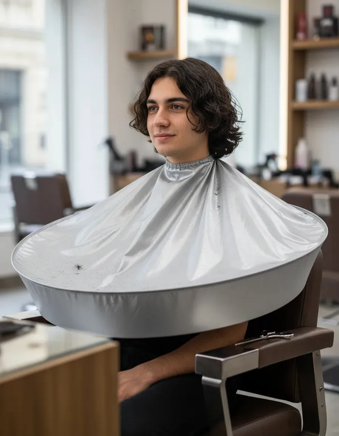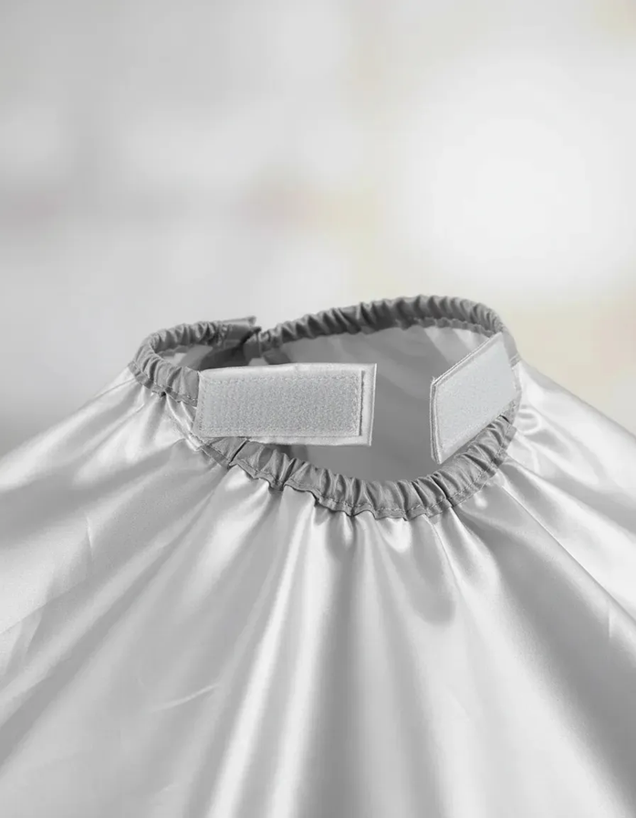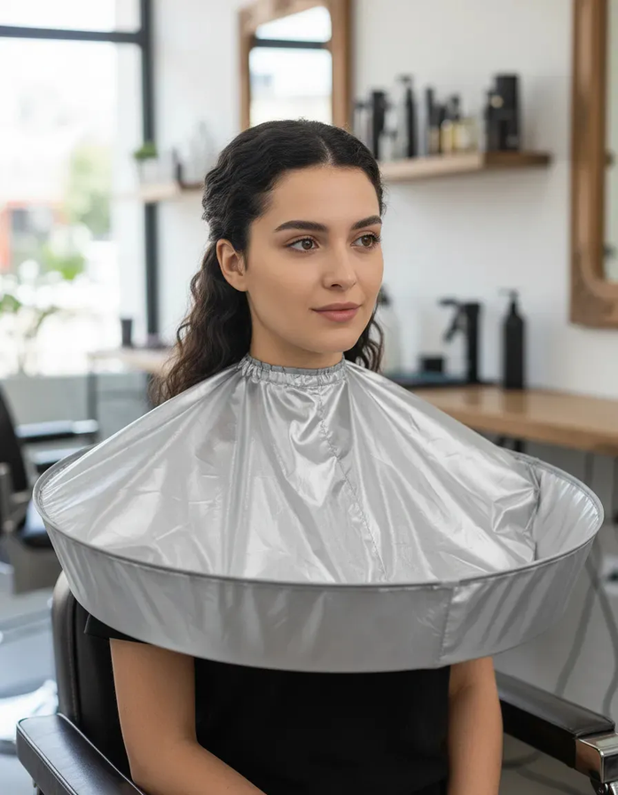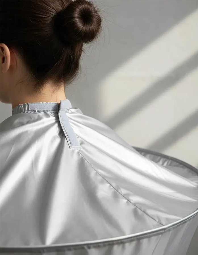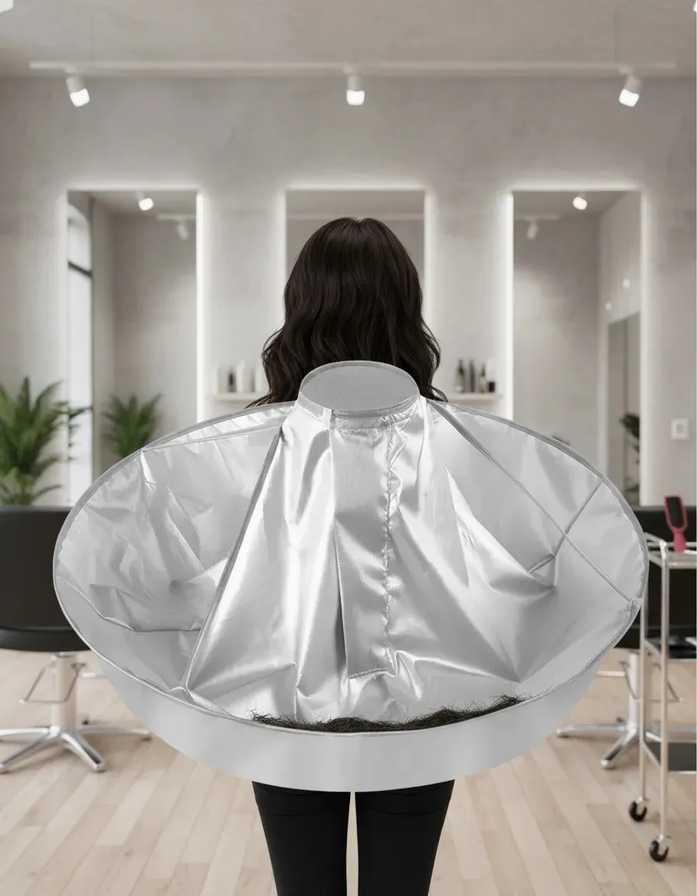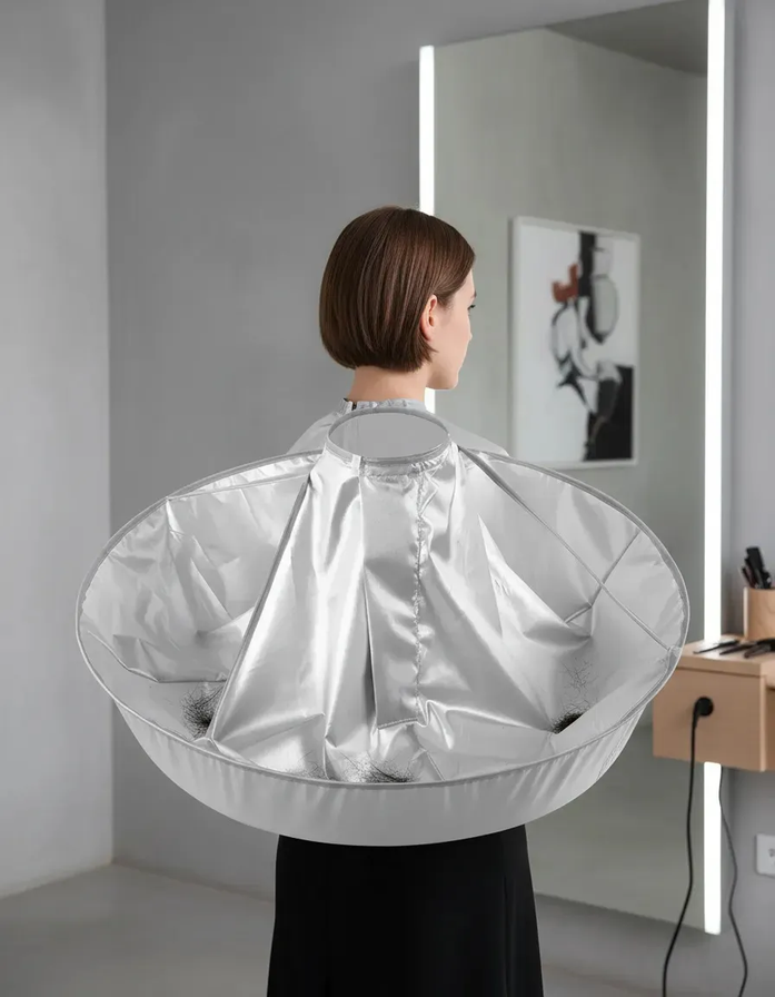 Diseño paraguas invertido: adiós a los pelos molestos. A diferencia de las capas tradicionales, esta capa cuenta con un borde reforzado que forma una ranura perimetral donde queda atrapado el cabello cortado. Al finalizar, simplemente retirá la capa y desechá los pelos acumulados sin ensuciar nada.