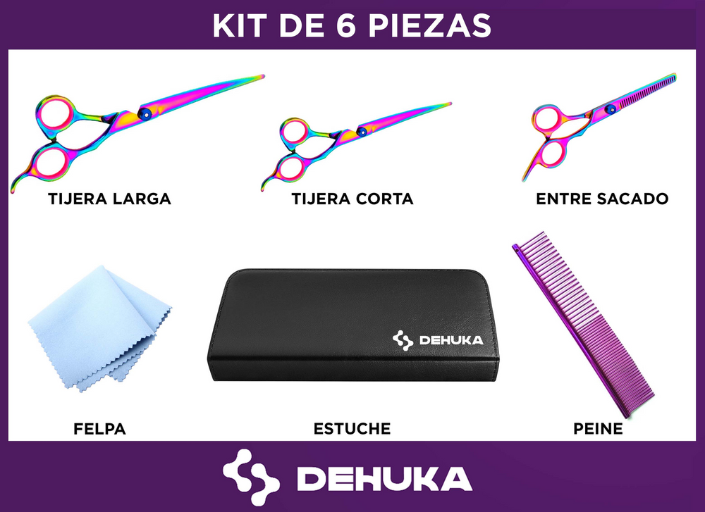 El Set Profesional Dehuka para Peluquería Canina es la elección perfecta para groomers profesionales o dueños de mascotas que buscan resultados salon-quality en casa. Este kit completo incluye tres tijeras especializadas fabricadas en acero japonés 440C, conocido por su filo duradero y resistencia a la corrosión.