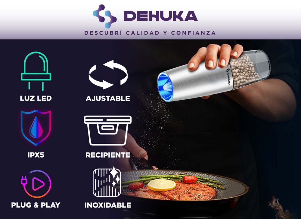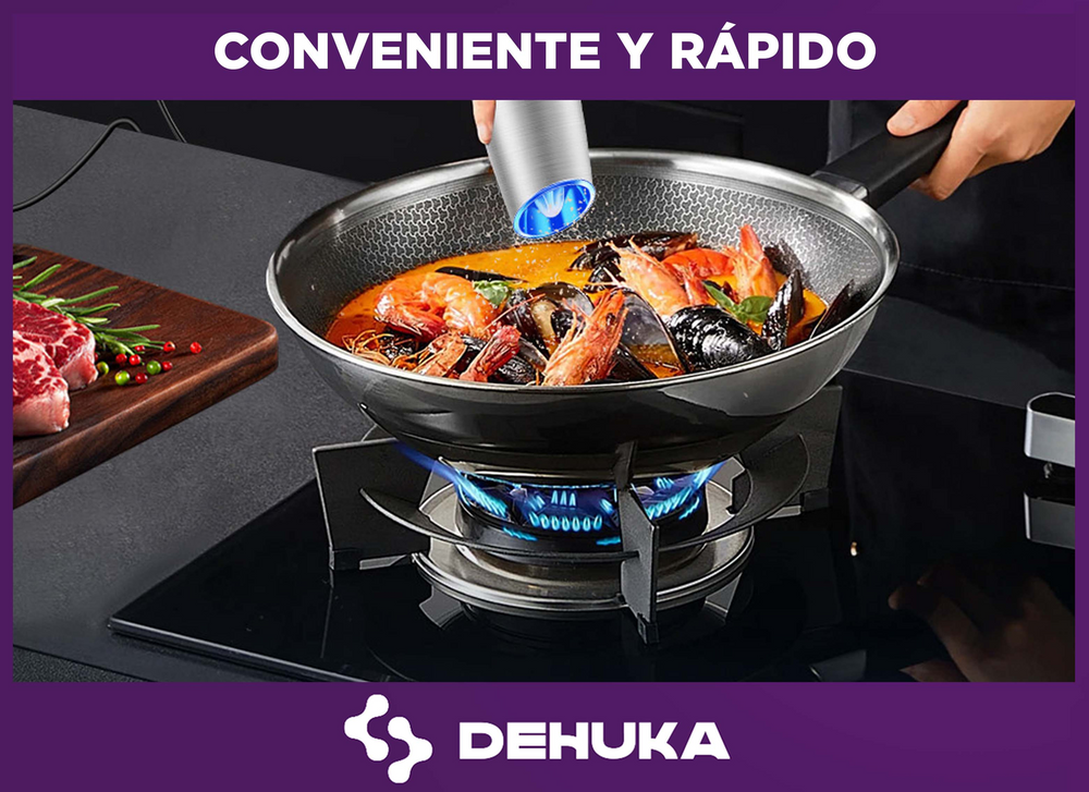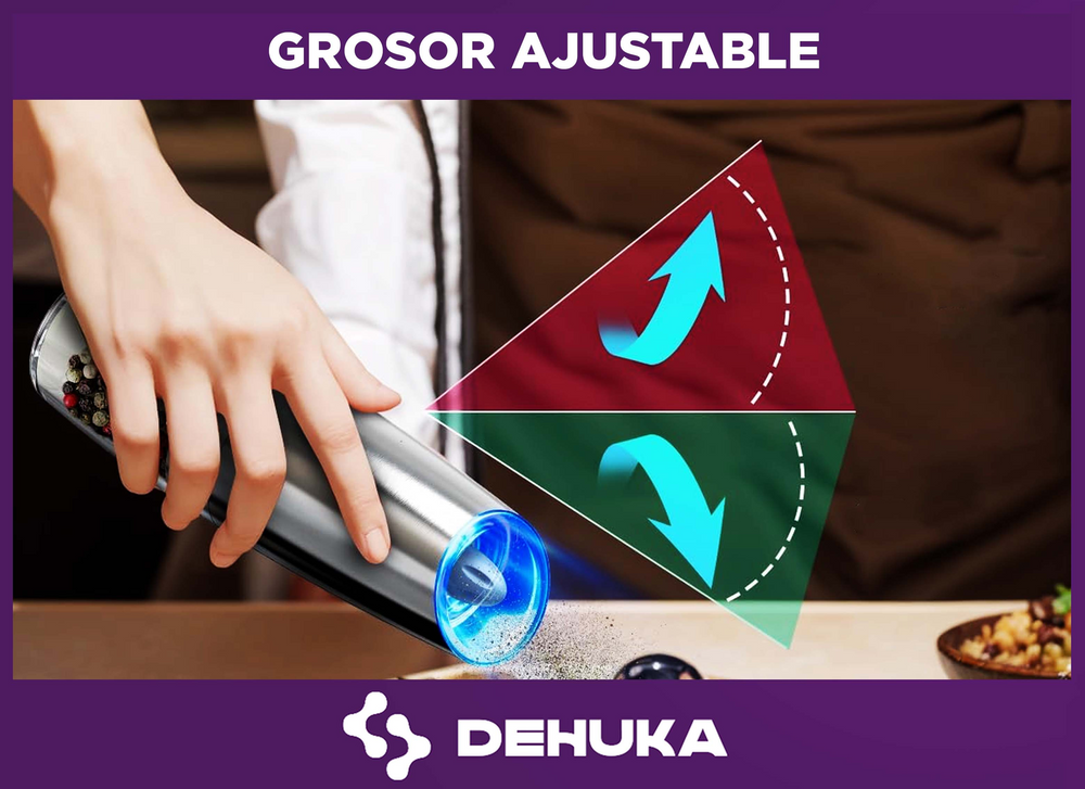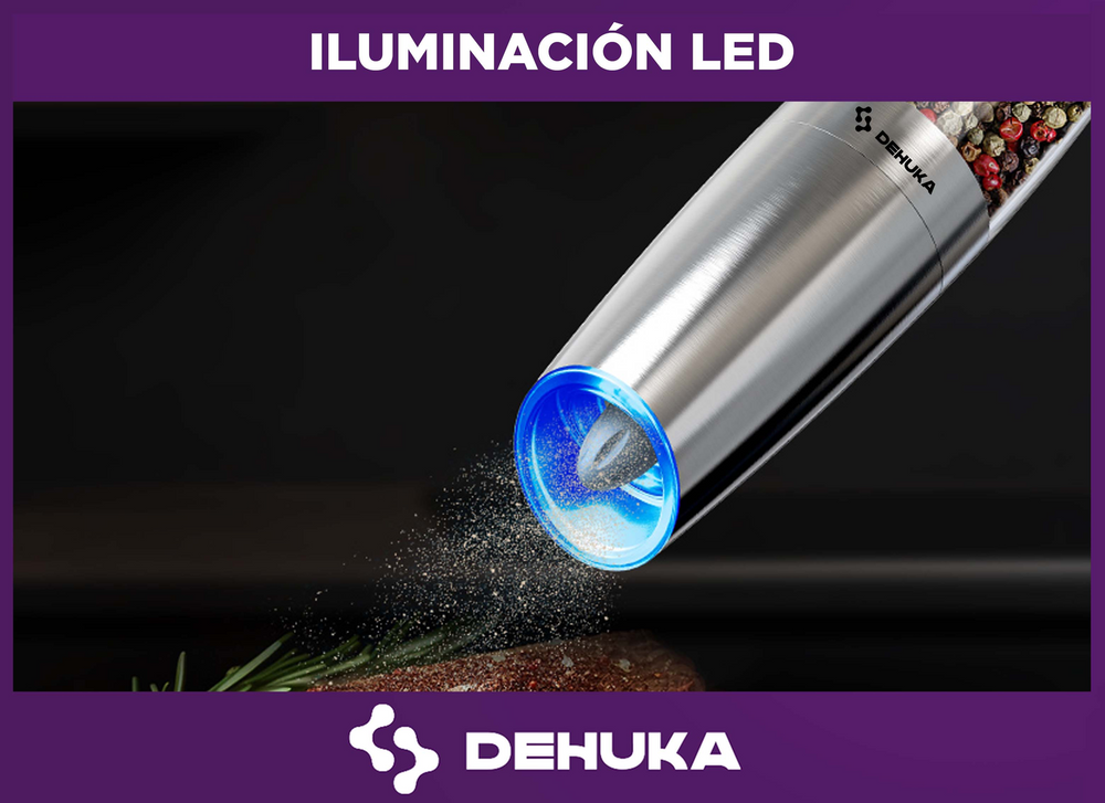 El Molinillo Pimentero Eléctrico Dehuka combina tecnología y diseño para revolucionar tu experiencia culinaria. Con su mecanismo cerámico ajustable, muele pimienta, sal gruesa o especias al instante, mientras la luz LED integrada ilumina la cantidad justa para tus platillos.