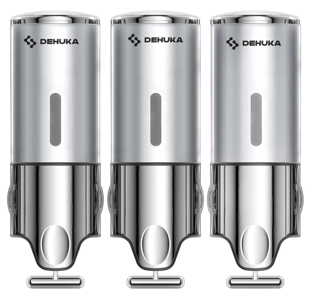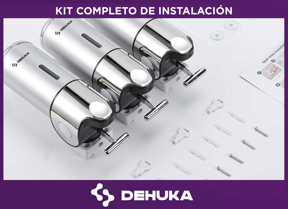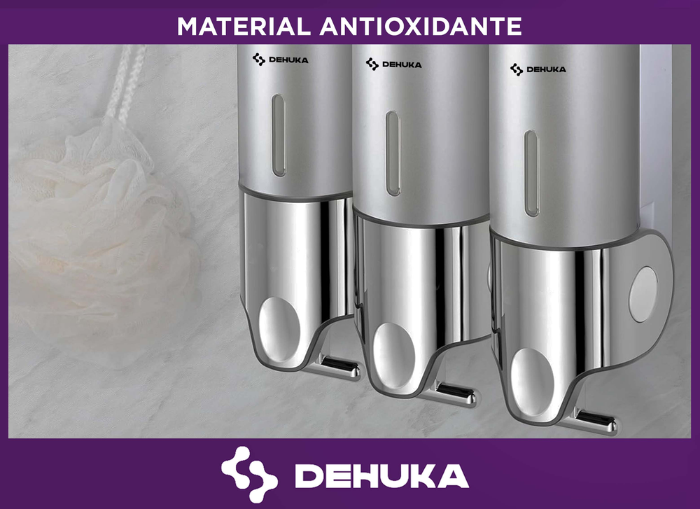 El dispenser triple amurable Dehuka ofrece una solución práctica y ordenada para la dosificación de productos líquidos como jabón, shampoo, crema corporal o alcohol en gel. Cada uno de sus tres compartimentos cuenta con una capacidad de 500 ml, sumando un total de 1500 ml, lo que permite un uso prolongado sin necesidad de recargas constantes.