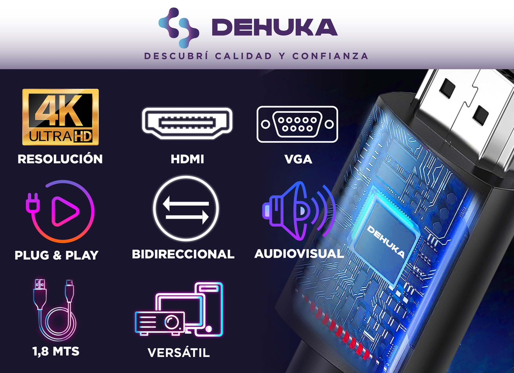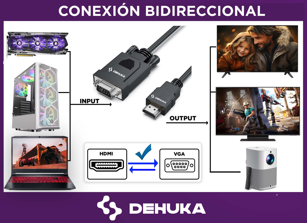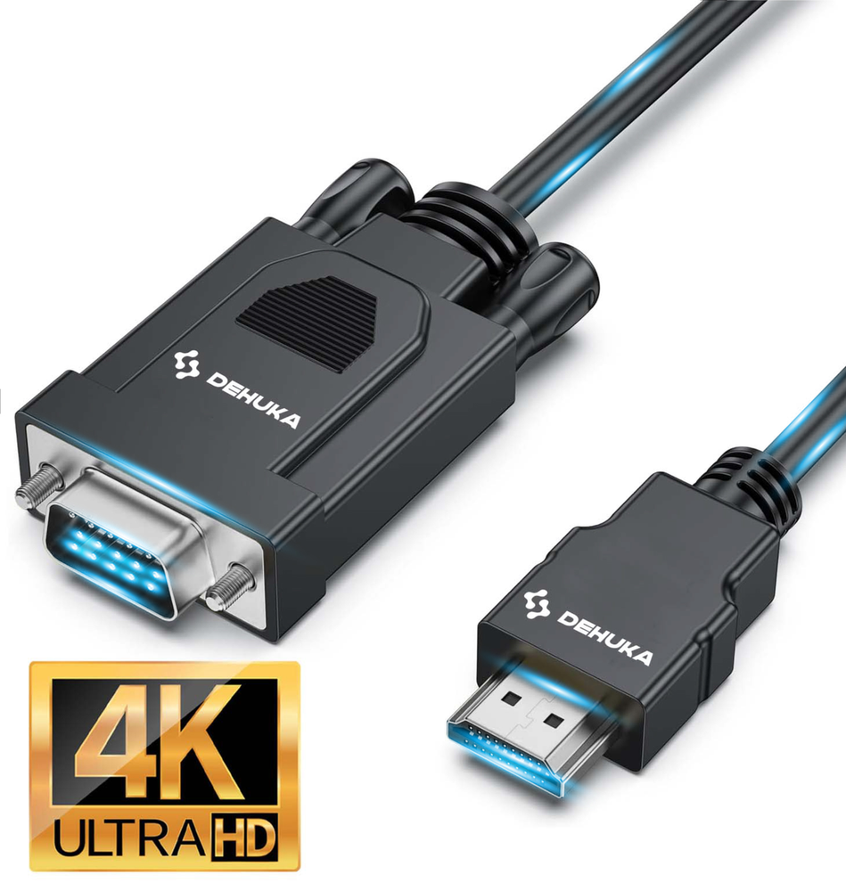 El Cable HDMI a VGA DEHUKA es el adaptador perfecto para conectar dispositivos modernos con salida HDMI a monitores, proyectores o televisores que solo disponen de entrada VGA.