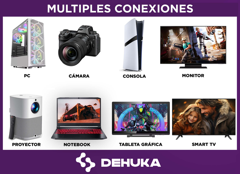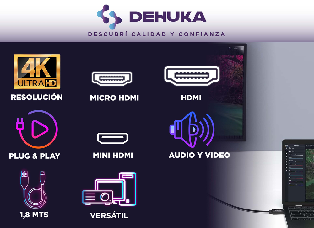 Conectá sin límites. El Cable HDMI 1,5 m DEHUKA 3 en 1 viene con adaptadores Mini y Micro HDMI, ideal para conectar múltiples dispositivos como cámaras, tablets, drones o proyectores, sin necesidad de cables extra. Su largo de 1,5 metros te da total libertad para configuraciones amplias, desde estudios en casa hasta aulas o salones. Fabricado con conductores de alta calidad, mantiene la integridad de la señal incluso a distancia, reduciendo pérdidas visuales y garantizando una reproducción clara hasta en Full HD. Además, el cable flexible y resistente está listo para uso prolongado en estudio o campo. Con DEHUKA, tenés la mejor compatibilidad y confiabilidad al alcance de todos.