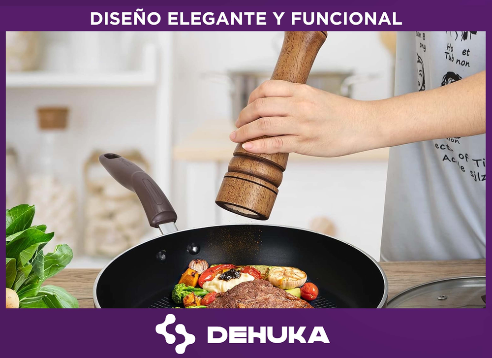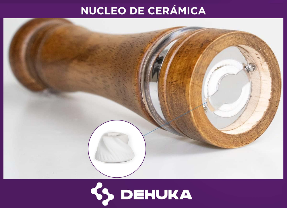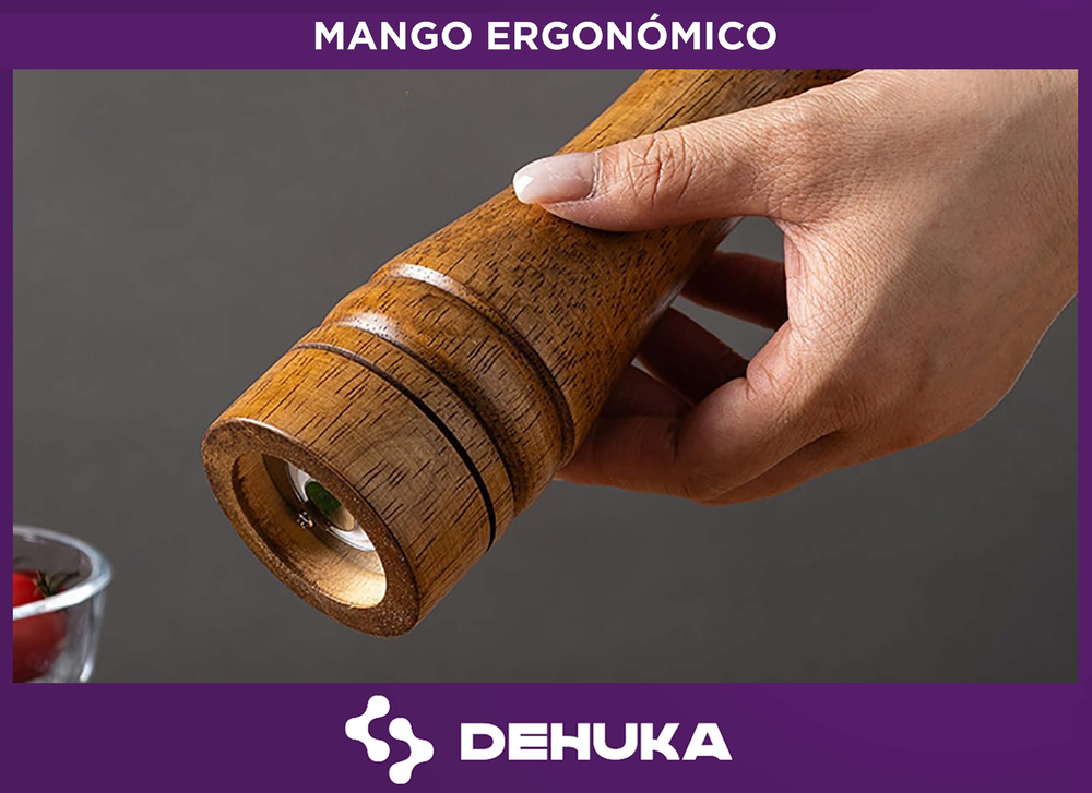 El Molinillo de Pimienta Dehuka combina elegancia y funcionalidad con su estructura de madera natural y núcleo de cerámica resistente, diseñado para ofrecer una molienda precisa y duradera. Con una altura de 26,5 cm, permite un agarre cómodo y controlado, ideal para moler sin esfuerzo.