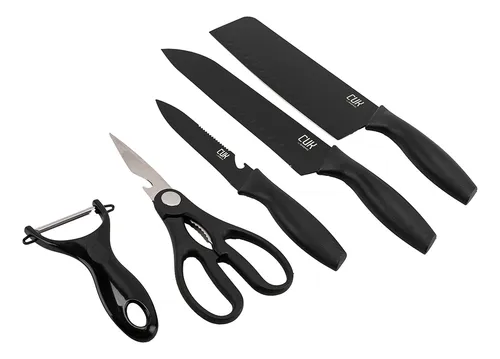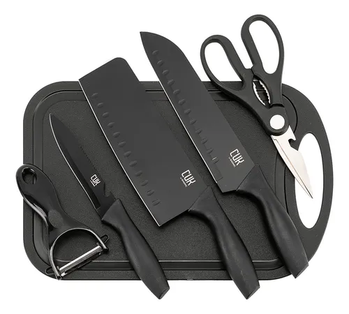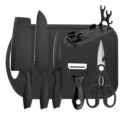 Set completo de 7 piezas esenciales: Incluye cuchillo chef, cuchillo para verduras, cuchillo para pan, cuchillo deshuesador, cuchillo multiusos, pelador y soporte.